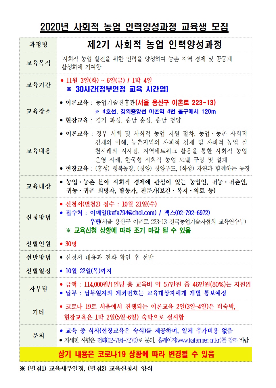 [교육대상] : 2030세대(1984.1.1 이후 출생자)*교육인원의 20%미만은 타연령층 및 기정착 귀농귀촌인도 참가할 수 있음) | [교육시간] : 60시간 | 선발인원 : 25(명)
